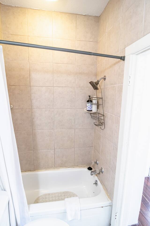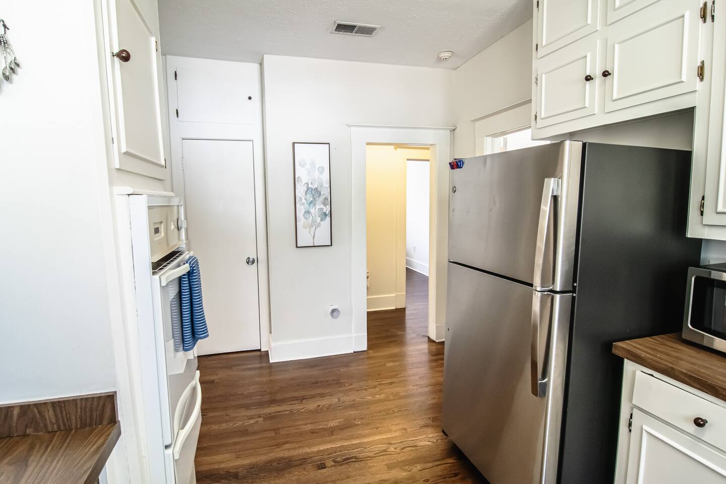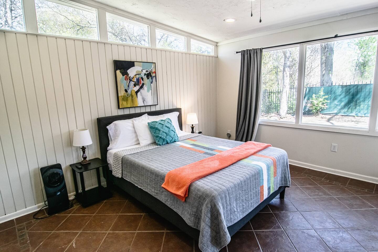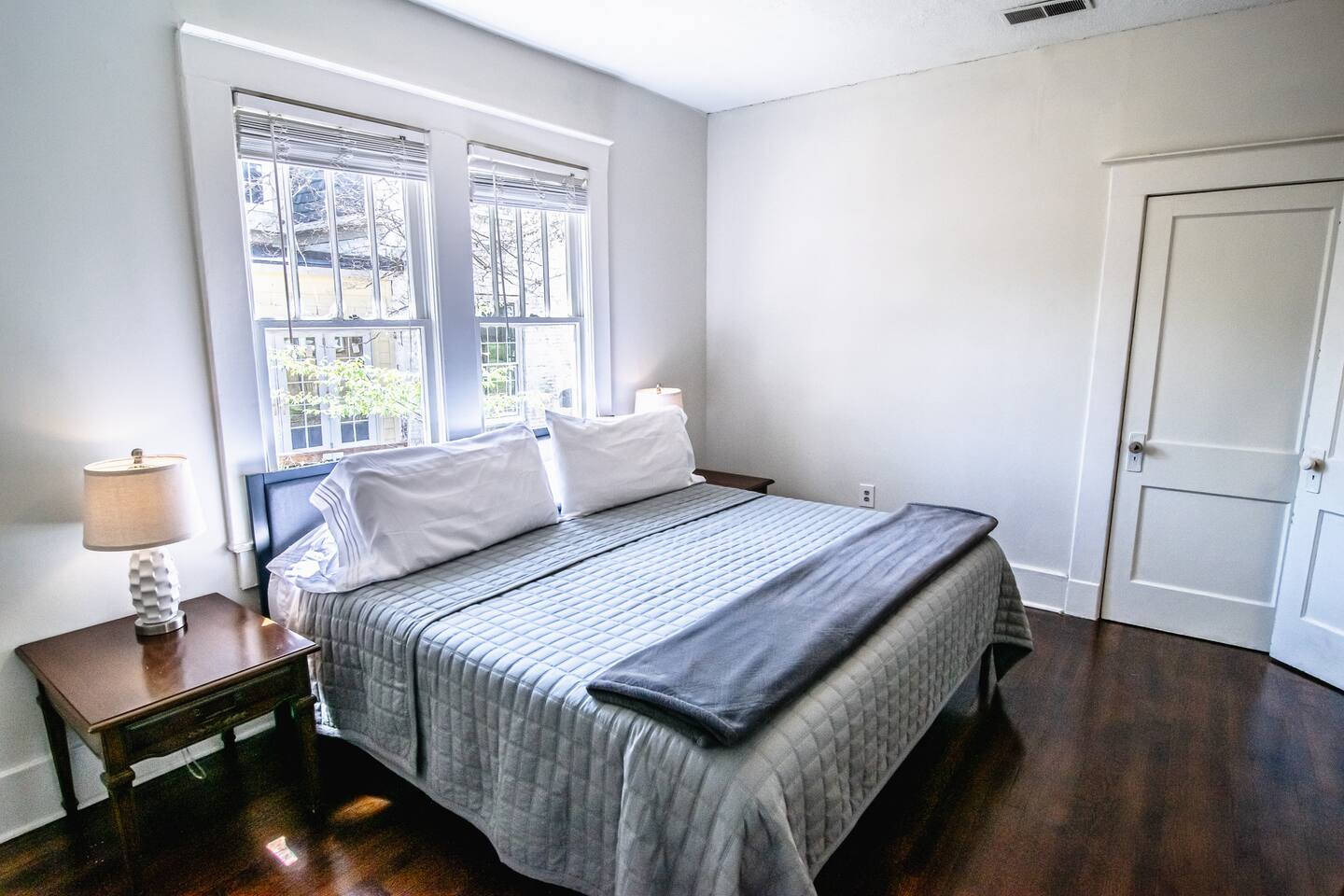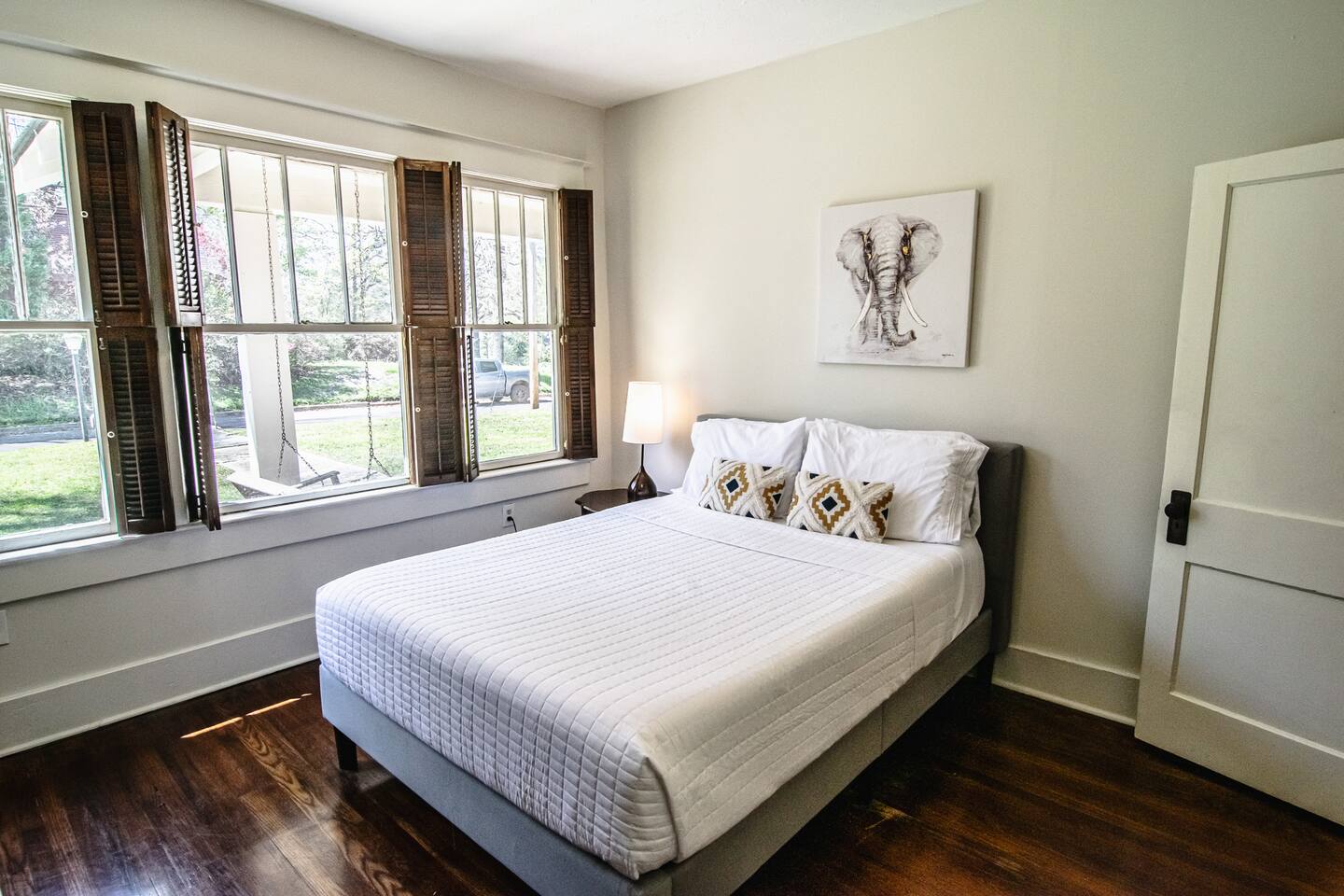 Living Room – Comfortable sofa and chairs, Smart TV, and bright natural light Kitchen & Dining – Fully equipped kitchen with modern appliances, coffee maker, cookware, and dining table for meals or workspace Bedroom 1 – King bed, ensuite bathroom, and ample closet space plus extra Twin bed in separate room Bedroom 2 – queen bed with fresh linens and storage Bedroom 3 – queen bed setup, great for kids or extra guests 2 Full Bathrooms – One ensuite bath and one shared bath, both stocked with fresh towels and toiletries Outdoor Spaces Front Porch – Charming spot to sip your morning coffee or unwind in the evening Backyard – Spacious, fenced-in yard ideal for relaxing outdoors or gathering with family and friends Parking – Driveway and on-site parking for multiple vehicles